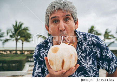 funny elderly male tourist drinks a drinking coconut with a straw on vacation on the beach by the sea in the tropics