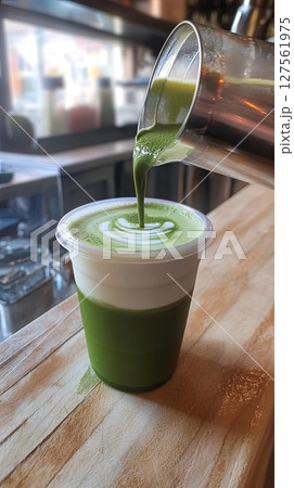 pouring matcha latte layers green foam top.
