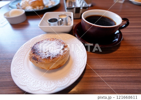 カフェのテーブルに並べられた変わった形のフレンチトーストとコーヒー
