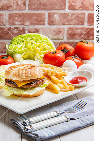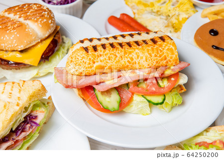 朝食、サンドイッチ、ハンバーガー、パンケーキ、卵、野菜、コーヒーで、ダイニングテーブル