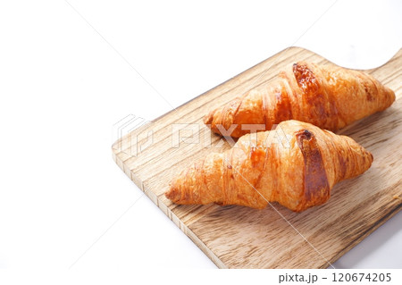 焼き立てのクロワッサンがサービングボードにのせられた、朝の風景のイメージ