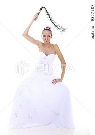 Wedding day. Bride with black flogging whip isolated