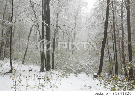 Early spring forest during snowfall