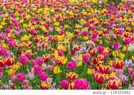 チューリップの咲きそろう公園