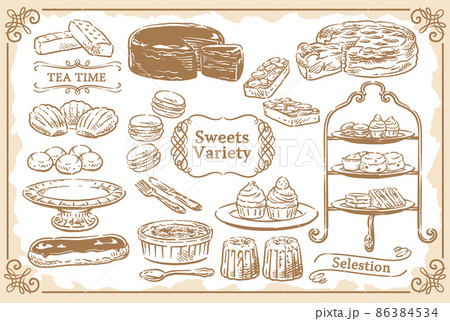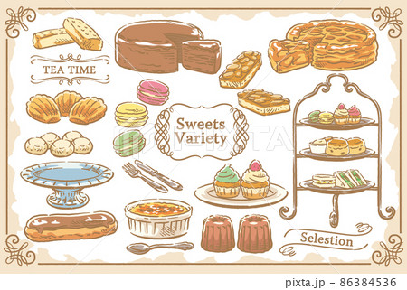 クラシカルなお菓子とフレームの素材セット。ベクターイラスト素材