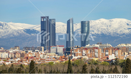Sierra de Guadarrama. Mountain system seen from the city of Madrid with the recently snow-covered mountains covering the entire top of the mountain range in a white blanket. Skyline next to mountains.