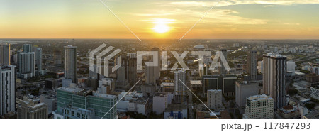 Aerial view of downtown office district of Miami Brickell in Florida, USA at sunset. High commercial and residential skyscraper buildings in modern american megapolis