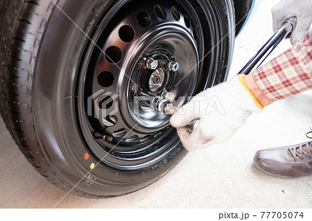 車のタイヤ交換と整備 メンテナンス (タイヤのナットを締める男性)