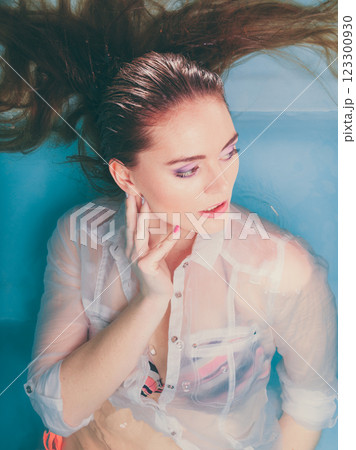 Portrait of sexy seductive woman in water.