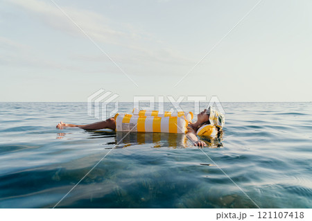 Woman Inflatable Float Relaxing Ocean - A woman relaxes on an inflatable float in the ocean on a sunny day.