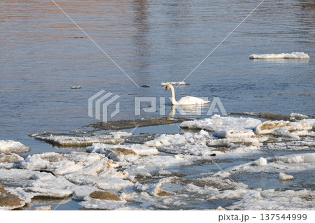 White Swan Swimming Among Floating Ice on Cold Winter Lake Under Soft Morning Light