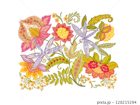 Fantasy flowers in retro, vintage, jacobean embroidery style