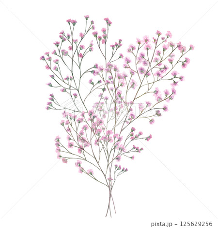 Pink gypsophila romantic bouquet watercolor illustration isolated background. Delicate hand painted baby breath flowers with green stems. Template for wedding invitations, stationery, packaging