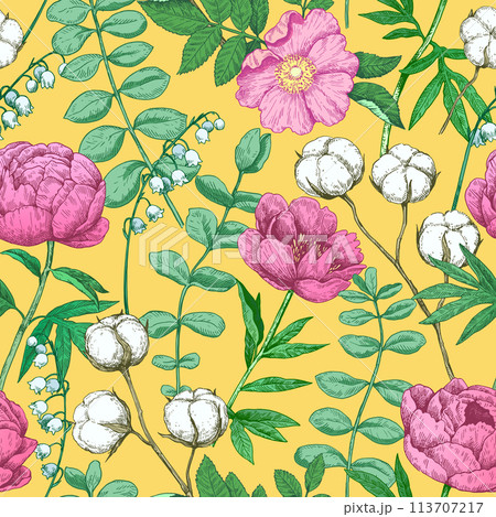 Colorful seamless pattern with peony and eucalyptus in victorian engraving style. Vector illustration.