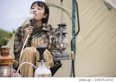 キャンプ場で水タバコを吸う若い女性 シーシャ