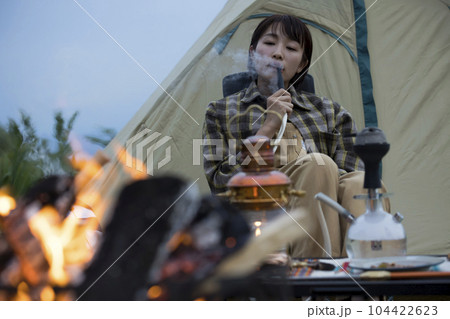 キャンプをしながら水タバコの準備をする若い女性 シーシャ
