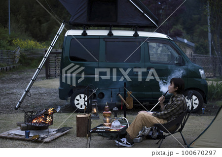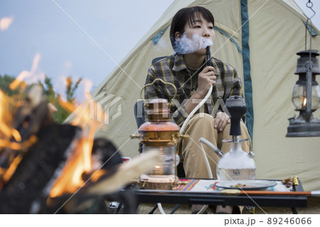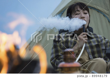 夕方キャンプで水タバコを吸う若い女性 シーシャ