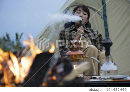 焚火をしながらで水タバコを吸う若い女性 シーシャ