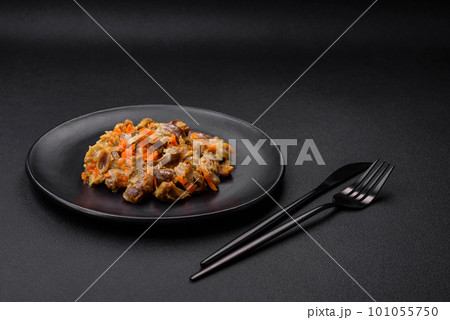 Fried rice with chicken, egg and vegetables in a plate. Black background. Top view