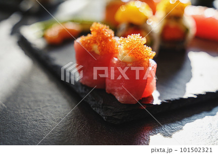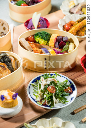 Japanese food in bamboo containers, closeup of a Japanese meal.