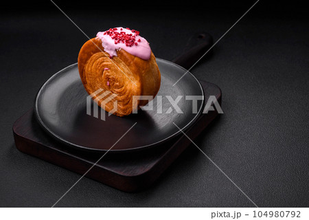 Roasted Stuffed chicken roll with cheese and ham on a steel plate. Dark background. Top view. Copy space