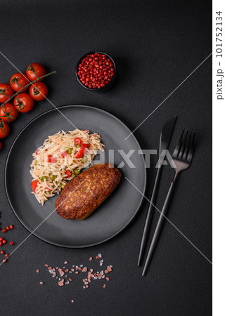 Delicious baked potato cutlet stuffed with chicken and vegetables, spices and salt