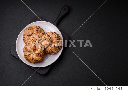 Delicious freshly baked crispy bun or kaiser roll with sesame seeds
