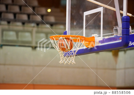 バスケットボールのシュートが入る瞬間のバスケットゴール