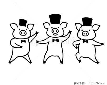 コミカルなダンスを躍る豚のキャラクターのシンプルな線画イラスト 透過背景の切り抜き