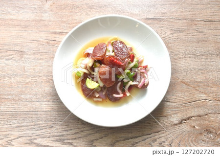 spicy and sour sweet slice Chinese pork sausage with vegetable salad on plate