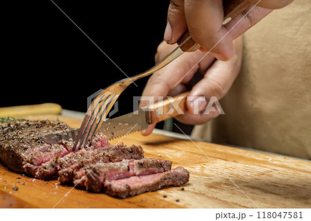 A person is cutting a piece of picanha meat with a knife and fork