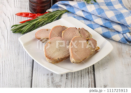 Roast Pork Neck sliced on a plate, top view