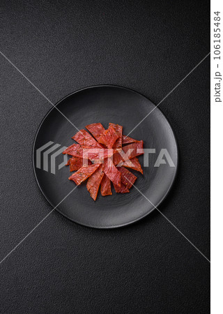 Jerky, dried pork meat slices with salt and spices