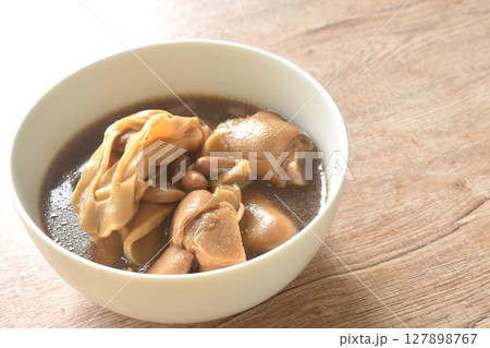 boiled slice Chinese bamboo shoot with pork leg and peanut in clear soup on bowl