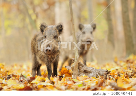 Two wild boar in autumn forest. Wildlife scene from nature