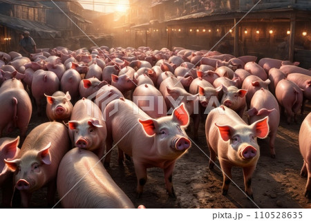 Lots of pigs in animal shed eating, standing and lying. Meat industry concept. Sows waiting to be fed up. AI