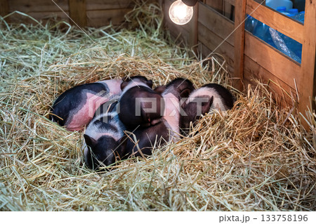 A group of curious and playful piglets exploring their cozy barn environment and surroundings