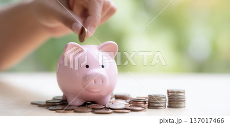 Saving Money Hand Dropping Coin into Piggy Bank