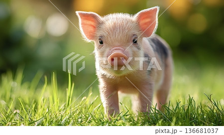 Piglet standing in green grass looking into camera