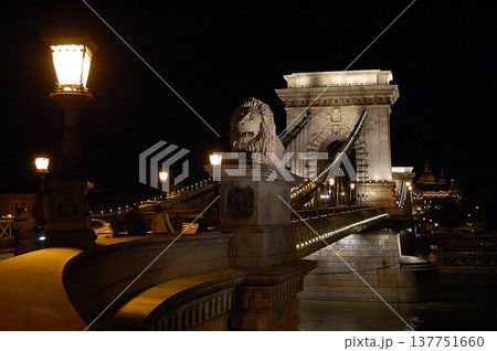 ハンガリー ライトアップされたブダペストのセーチェーニ鎖橋