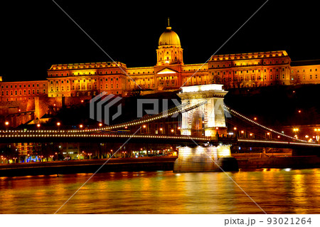 ハンガリー、ドナウ川から望むライトアップされたセーチェーニ鎖橋とブダ城