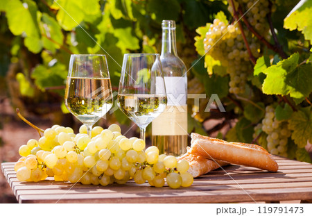 Glass of White wine ripe grapes and bread on table in vineyard