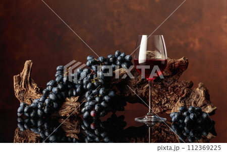 Glass of red wine with an old snag and blue grapes.