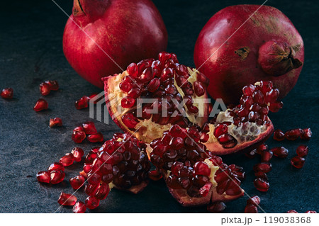 red ripe pomegranate fruits on dark background