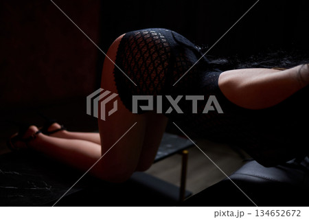 Sensual studio photograph highlighting elegant lingerie and confident posture, Artistic portrayal of provocative fashion in softly lit setting emphasizing charm and allure