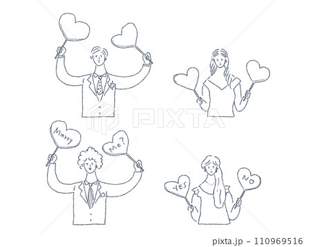 ハートのパネルを持った男性と女性、プロポーズ、カップル、線画