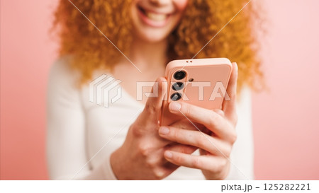 Happy woman chatting on phone and relaxing outdoors. Urban, people concept. Smiling 30s redhead woman text messaging on smart phone at sunny day on the city street, spring time
