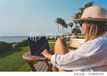 Confident businesswoman typing on laptop in open air green park in summer. Online task management