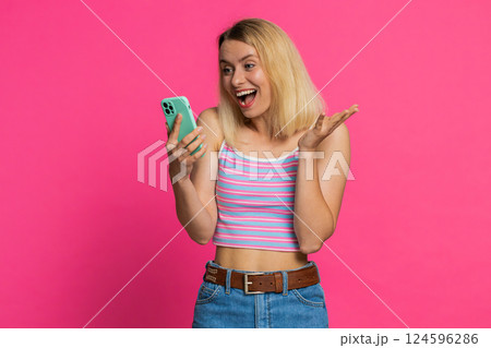 Modern caucasian young woman 20s with phone, teenage girl looking at smartphone in bright clothes