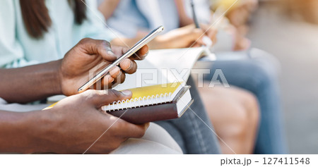 Online Education App. Modern Smartphone In Hands Of Unrecognizable African American Male Student, Cropped Image, Closeup
